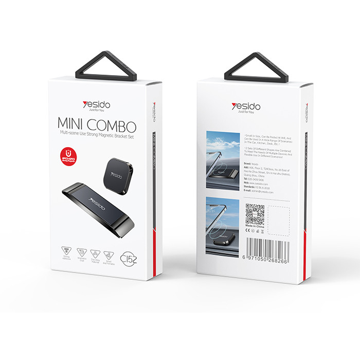 مینی هولدر مگنتی موبایل یسیدو YESIDO C152 محصولی از کارخانه یسیدو است. هولدر از جنس آلیاژ آلمینیوم با کیفیت و مقاوم و روکش سیلیکونی محافظ گوشی تشکیل شده است. این محصول دارای 6 آهنربا کنار هم چیده شده اند و یک میدان مغناطیسی قوی تشکیل داده است و در دیگری 4 آهنربا تعبیه شده است. میدان مغناطیسی بر سیگنال ها و شبکه موبایل تاثیر منفی ندارد. هولدر در سایز 3x7 سانتی متر میباشد و دیگری در سایز 3.7x3.7 سانتیمتر است. در سرعت بالا و دست انداز و پستی بلندی ها هولدر گوشی را نگه میدارد و نمیافتد. نصب و برداشتن گوشی بر روی هولدر به راحتی و با یک دست است. قابلیت نصب با چسب نانو خیلی قوی بر هر قسمت که راننده دسترسی راحتی دارد و گوشی به صورت افقی و عمودی قابل نصب است. مناسب برای تقریبا همه گوشی های بازار است.