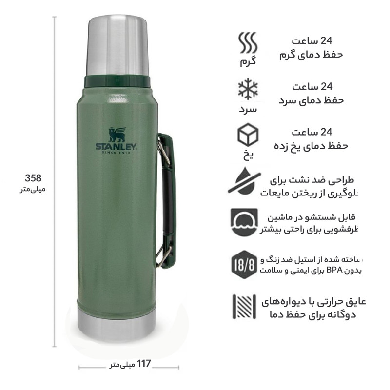 به همراه داشتن قمقمه و فلاسک برای نگهداشتن آب موردنیاز سفر ضروری است. فلاسکهای پلاستیکی قادر به نگهداری آب در دماهای مختلف نیستند؛ ازاینرو به همراه داشتن یک فلاسک خوب و باکیفیت در سفر ضرورت دارد. فلاسک «استنلی» مدل «Classic» با ظرفیت 1.4 لیتر، دارای ابعاد و وزن مناسب برای سفرهای خانوادگی است. نوع سری و بدنهی استیل این فلاسک امکان قراردادن مایعات را بدون نگرانی برای شما فراهم میآورد؛ زیرا جنس آن ضدزنگ است. بهعلاوه با قابلیت حفظ دما تا 40 ساعت داغ و 35 ساعت سرد، امکانی را فراهم میکند تا هر زمان که خواستید از نوشیدنی گرم و یا سرد خود استفاده کنید. همچنین دهانه و سری آن در هنگام بستهشدن، مایعات را به بیرون نمیریزد و میتوانید بدون نگرانی از ریختن محتویات، فلاسک استنلی را در هر شرایطی نگهدارید. فلاسک استنلی مدل Classic ظرفیت 1.4 لیتر با کیفیت و جنس خوب، گزینهای مناسب برای سفرهای طولانیمدت خواهد بود و با داشتن آن از نوشیدنی گرم و استراحت در حین سفر لذت خواهید برد.