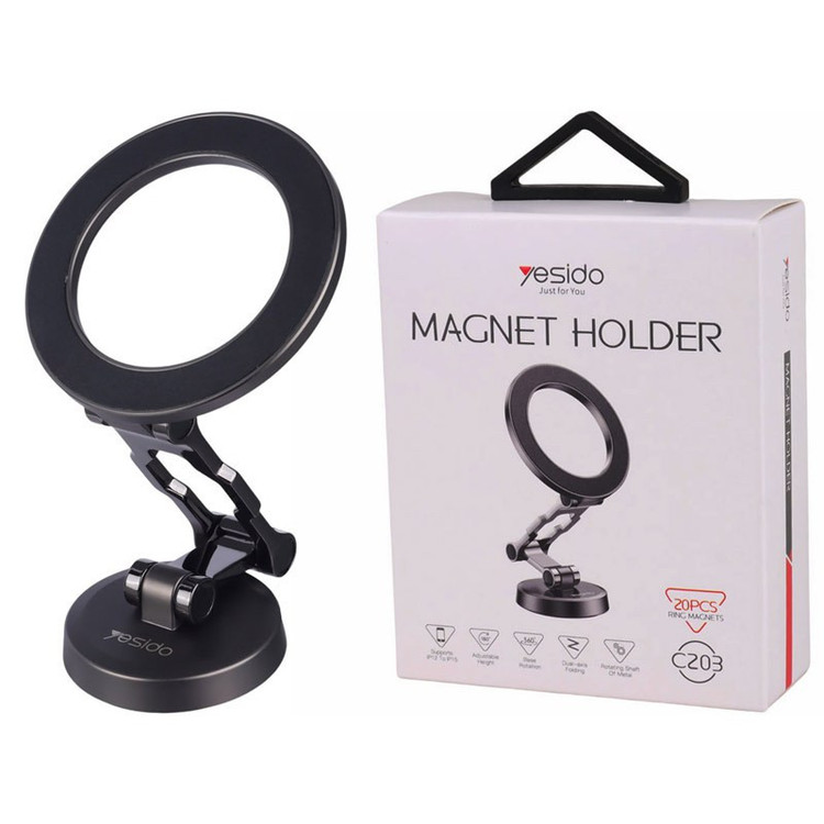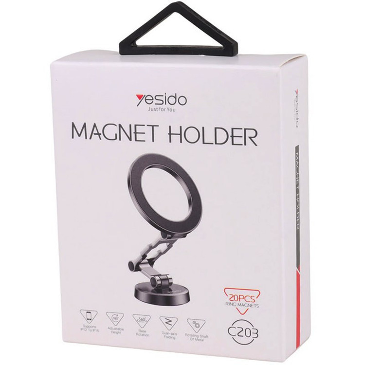 ایه نگهدارنده گوشی موبایل یسیدو مدل C203 محصولی از کارخانه یسیدو است.مجهز به نگهدارنده مغناطیسی با آهنربای قدرتمند، مناسب برای گوشی آیفون سری 12 به بالا است. بدنه ساخته شده از متریال آلیاژ روی و پلاستیک ABS، مقاوم در برابر ضربه و فشار احتمالی است.برخوردار از قابلیت چرخش 360 درجه و تغییر زاویه 180 درجه، دارای تحمل وزن 1.2 کیلوگرم است.بهره مند از روکش سیلیکونی به منظور جلوگیری از خط و خش بر روی گوشی است.پایه چسبی از جنس نانو برای اتصال به داشبورد و سطوح صاف است.وجود 2 عدد پد فلزی برای چسباندن به پشت قاب گوشی موبایل همراه محصول است.